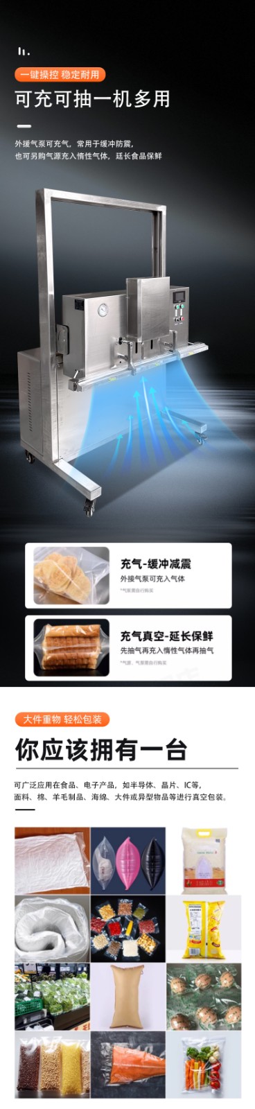 適用于需通過真空隔絕空氣、防止氧化變質(zhì),或通過充氣(如氮氣)維持口感的食品,尤其適配大份量 / 大尺寸食材: